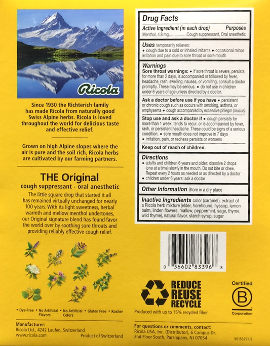 6+ 리콜라 Ricola GMO-프리 오리지널 기침 드롭 45pc
