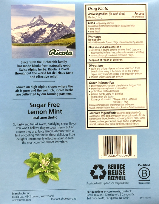 6+ 리콜라 Ricola 슈가/GMO-프리 레몬 민트 인후통 드롭 45pc