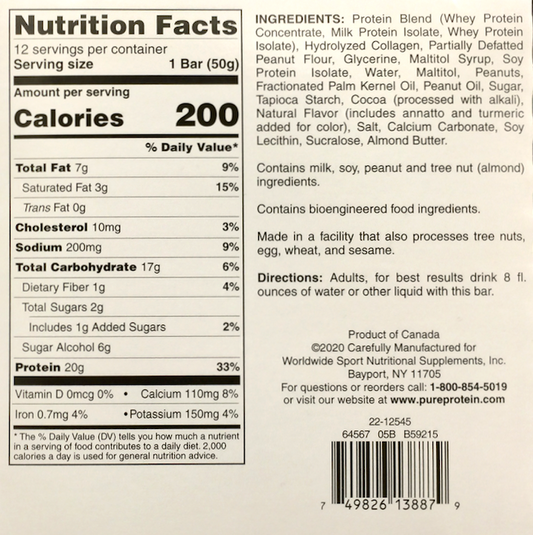 퓨어프로틴 Pure Protein 글루텐-프리 초콜렛 땅콩버터 단백질바 50g 12ct (600g) *단백질 20g*