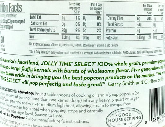 졸리 타임 Jolly Time Non-GMO 옐로 팝콘 옥수수 캐니스터 850g