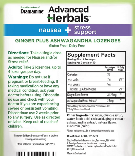 드라마민 Dramamine 생강 15mg + 애쉬와간다 난드라우지 (졸음없는) 스트레스•입덧•구토감•멀미완화 캔디 20정
