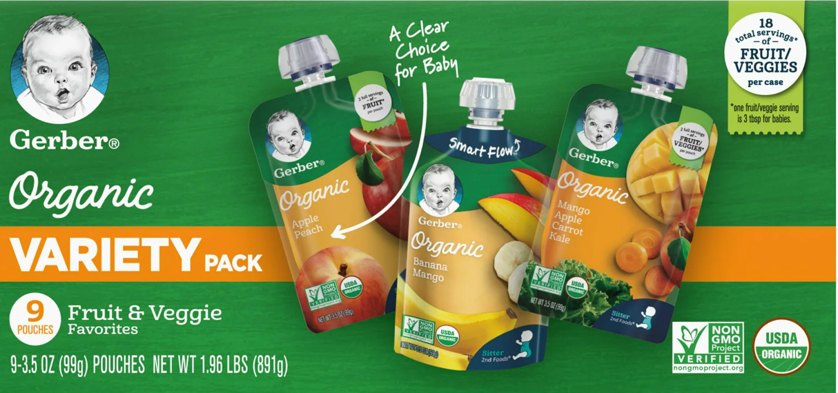 네슬레 Nestle 거버 유기농/Non-GMO 과일 & 야채 파우치 3가지맛 #3 9ct (891g)