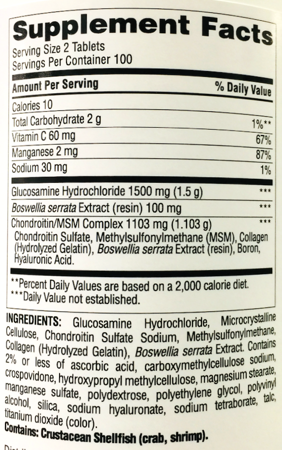 • 각 정 글루코사민 750mg, 콘드로이친/MSM 복합체 551mg, 보스웰리아 추출액  50mg, 비타민 C 30mg, 망간 1mg
