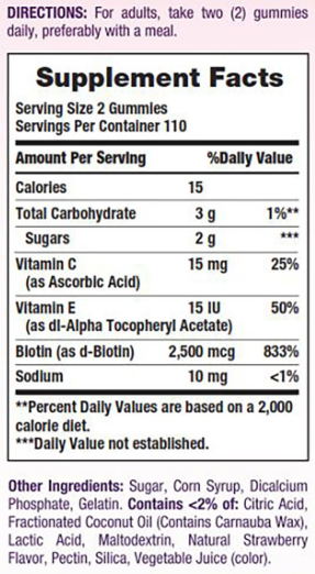 • 각 2정은 비오틴 2500 mcg, 비타민 C 15mg, 비타민 E 15 IU를 제공합니다